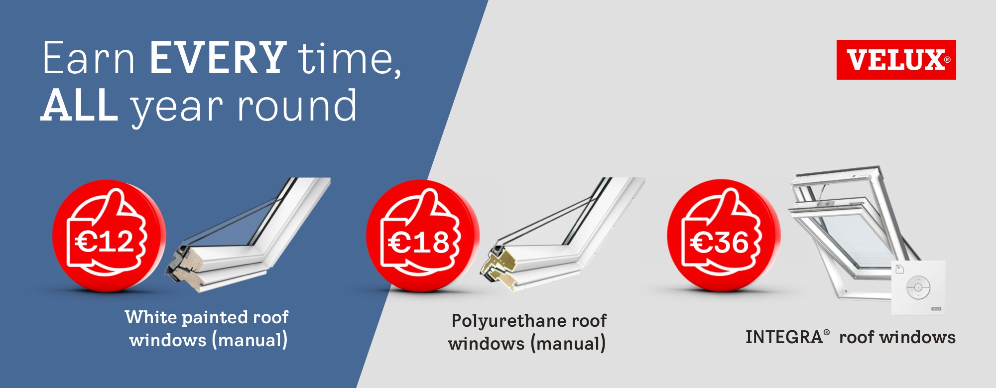 Claim VELUX Rewards on EVERY purchase of a VELUX roof window, flat roof window, blind or sun tunnel.